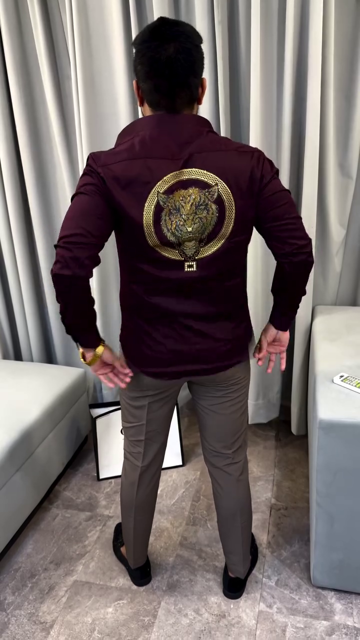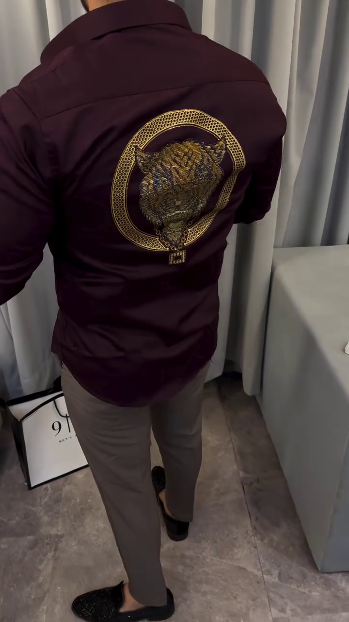+ Free ShippingBurgundy solid party shirt, has a spread collar, button placket, embellished detail, long regular sleeves, curved hem